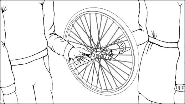 Fred picks up the bike wheel. He keeps the wheel between himself and his mother.