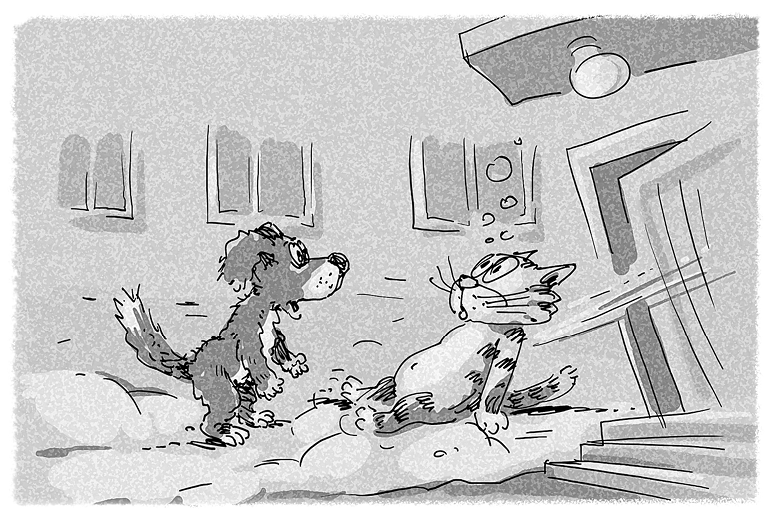 Дверь подъезда никак не хотела открываться. Страус уже разбежался, чтобы как следует её толкнуть, но дверь вдруг распахнулась сама собой, и внутрь ввалился почтальон с целой грудой коробок и коробочек в руках. Кот Страус мухой вылетел на улицу и приземлился точно перед Тузиком. Пёс вздрогнул: