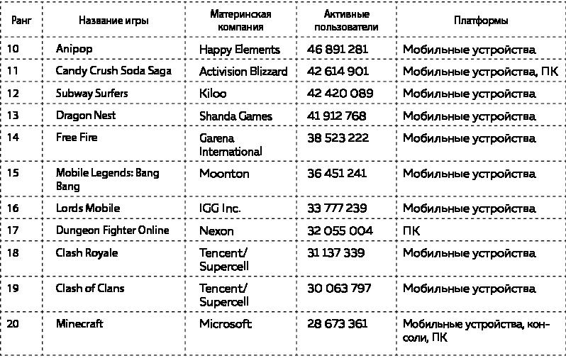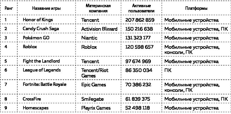 Однако сегодня эта отрасль ориентирована на более широкую аудиторию. Например, летом 2016 года тысячи игроков Pokémon GO вышли на улицы крупных мегаполисов по всему миру в поисках покемонов. Новости о толпах людей, играющих средь бела дня, показали, насколько популярными и широко распространенными стали игры. От Вашингтон-Сквер-парка в Нью-Йорке до Сибуйского перекрестка в Токио по улицам бродили тысячи игроков. Все это кардинально изменило представление боссов компаний о том, как выглядит среднестатистический геймер. Если Pokémon GO – наиболее очевидный пример того, насколько популярны в последнее время стали игры, то можно смело сказать, что он не исчерпывающий. Теперь аудиторию привлекают продукты, насчитывающие десятки миллионов постоянных игроков, например, Candy Crush Saga, Roblox, League of Legends и Fortnite: Battle Royale (см. таблицу 1). Аудитория интерактивных развлечений выросла и превратилась в огромный рынок. Кроме того, в процессе роста она трансформировалась.