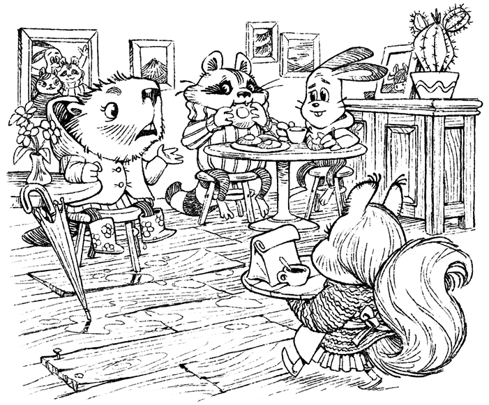 — Уму непостижимо! — снова нахмурившись, начала Фибер. — Можете себе такое представить? — она доверительно наклонилась через проход к еноту и зайцу и зашептала: — Вы знаете, у меня шестеро детей. Это столько стирки! Так вот, вчера я их постирала, развесила. Выхожу сегодня снимать! — воскликнул она и, вздохнув, добавила: — Эх, а я давно говорила, что они меня с ума сведут. Ничего там нет! Как вам? А? — и Фибер победно стукнула лапкой по столу — так, что посетители в зале испуганно обернулись.