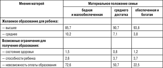 Задумываясь о будущем ребенка, родители прежде всего оценивают возможность получения им образования, причем, здесь просматриваются особенности пожеланий родителей, относящихся к разным социальным слоям (табл.1.3). Хотя оценки достаточно близки, но тенденции очевидны – представители бедных семей в большинстве своем думают о высшем образовании для своего ребенка, в настоящее время находящегося в дошкольном возрасте, когда оценки перспектив более оптимистичны, чем в более старшем, но уже каждый десятый думает только о среднем.