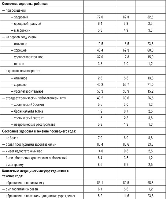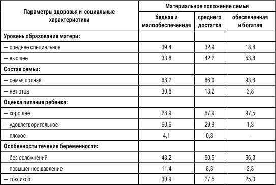 Особенности формирования здоровья в группах детей, происходящих из семей с разным социальным статусом, были изучены на детях г. Москвы, посещающих детские дошкольные учреждения, путем анкетирования родителей (опрошены родители 1100 детей 4–6 лет, родившихся после 1994 г.). Распределение семей по уровню материального благосостояния (бедные и малообеспеченные семьи – 31,8 %, семьи среднего достатка – 60,8 %, обеспеченные и богатые семьи – 7,4 % к общему составу опрошенных) основано на самооценке.