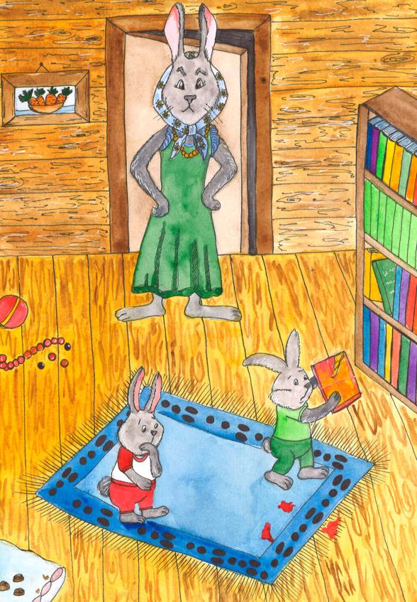 В этот момент зашла мама Зайчиха. Она хотела сказать Пуше и Шуше, что напекла морковных ватрушек, но сразу поняла, что зайцы что-то натворили, так как у Пуши опустились уши, и нервно задрожал хвост. Шуша спрятался за книжный шкаф.