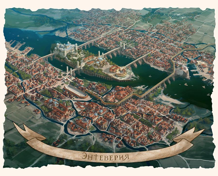 Были построены два новых акведука и большая клоака для стока нечистот. Город утопал в зелени садов и парков, а слух его жителей услаждал плеск десятков больших и малых фонтанов, выдававших причудливые мелодии благодаря хитроумным водяным орга́нам. Столица могла позволить себе неслыханную роскошь – отдать треть своей земли под территорию, не имеющую никакого отношения ни к жилью, ни к каким-либо производственным нуждам. Это был огромный организм, который вбирал в себя людей и товары и тут же обменивал их на шикарную, беспечную жизнь или хотя бы чувство приобщенности к ее главному центру в Дашторнисе. Энтеверия имела пару речных гаваней, которые благодаря полноводным рекам превратили ее в порт двух морей. На севере пузатые торговые корабли могли свободно подниматься по руслу Фелы вплоть до моря Драконов, через которое лежал путь к варварам Великой Шири и в Торгендам. По многочисленным притокам Великой реки можно было свободно добраться до большинства северных и западных провинций империи.