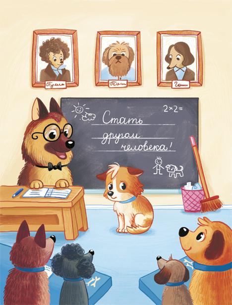 Тим робко вошёл в класс и осмотрелся. В классе было светло и просторно. Здесь помещались шесть парт, учительский стол и портреты известных собак над доской. Но всё, что увидел Тим за пару мгновений, – это одиннадцать блестящих носов, и каждый нос принюхивался к нему. Тим поёжился.