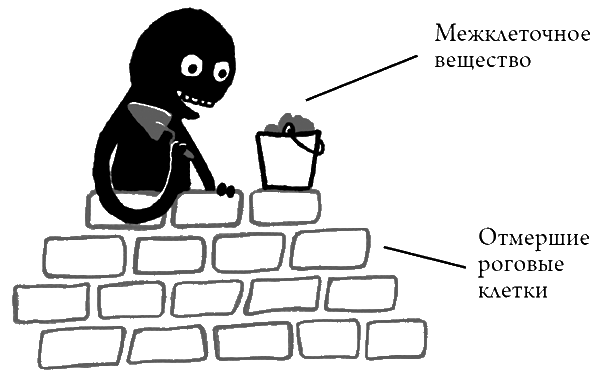 Под микроскопом можно увидеть, что отмершие клетки выглядят как маленькие кирпичики. Хоть они и миниатюрные, но очень прочные, потому что состоят из твердого кератина. Эти маленькие прочные роговые клетки связаны субстанцией, похожей на цементный раствор. Она не только связывает кирпичики между собой, но и предотвращает проникновение чужеродных тел через отверстия между кирпичиками. Поэтому мы, дерматологи, называем эту конструкцию кирпично-известковой моделью.