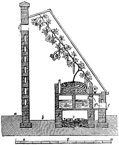 The importance of bottom heat in the culture of tender plants, being a practical fact established beyond question, another consideration arises as to the best means of producing it, and of regulating its application. Various substances and materials have been submitted to a process of fermentation, and so employed to effect it: stable manure, tanner’s bark, and the leaves of trees, are among the principal of these materials, and either of them will supply just what the plants require, as truly as these wants can be supplied by any other means; but from their very nature, they are violent, and fluctuating, and ephemeral in their action, and setting aside the labour which the employment of them necessarily involves, we have in these particulars, the special points in which the tank system of applying bottom heat far excels them: it is uniform, and constant, in its action; there need be no apprehension of the soil becoming overheated, for the source whence it derives its warmth ought never to boil; neither need there be any fear of its decline, or of a want of power, for when once thoroughly heated, a body of water will part with it in such a manner, that a very little attention to the fire, and a very little expenditure of fuel, will maintain its temperature for an almost incredible length of time; and as to power, it never should for a moment form a question, because a powerful degree of bottom heat ought never to be applied: a close attention for one or two hours during the twenty four which form a day, will maintain any apparatus in an effective state of action, if it is properly erected. How different is this, to what has been in days now past! when in rigorous weather, with the heat of his dung bed declining, the cultivator knew that at the peril of his crop, he scarcely dared to attempt to revive it, without involving a more serious because an accelerated evil; at any rate, if at an immense sacrifice of labour, his dung casings were replenished piece by piece, he knew too well, that often many days would elapse, before their action would be efficient and satisfactory, unless indeed an unlimited supply of materials, were in a constant state of preparation. By means of the tank, a fire could be lighted up, and the required effect produced in as many hours, as days would have been formerly required.