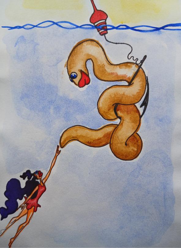 Ещё Мо хорошо помнила сон, где она была не такая длинная, как всегда, она вообще была какой-то очень маленькой и под водой (что было странно для неё), в её огромные глаза смотрели два таких же огромных глаза ещё более огромного червяка, прицепленного к крючку. Она тянула свои крохотные ручки к этому большому червяку, что заполнил собой весь её сон. Он спокойно улыбался и ждал, когда Мо уже прикоснётся к нему. А она, без доли сомнения, прикладывала все усилия для оправдания его ожидания. Но ноги как будто не знали, как вести себя под водой, и всё было напрасно. Она так и просыпалась с шевелящимися ногами, которые пытались сдвинуть её тело с места. Хорошо, что ничего у Мо не вышло. Ведь если для неё нет разницы между сном и явью, то, добравшись до крючка с червяком, скорее всего не было бы сказки о ней. Думаю, вы понимаете почему.