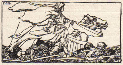 Then a strange thing took place before his eyes. A wondrous radiance, a mist of light, enveloped and hid the shepherdess. When it melted she was clad in shining armor, sitting on a white horse, and lifting a bare sword in her left hand.