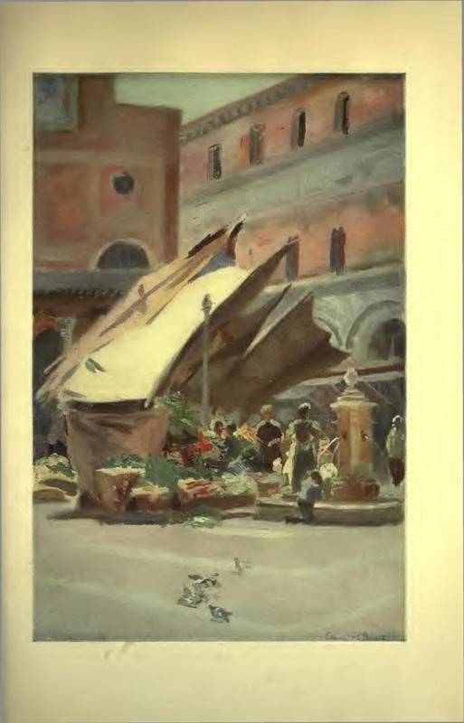 Across the Bridge began the vegetable and fruit market, where whole Hollands of cabbage and Spains of onions opened on the view, with every other succulent and toothsome growth; and beyond this we entered the glory of Rialto, the fish-market, which is now more lavishly supplied than at any other season. It was picturesque and full of gorgeous color for the fish of Venice seem all to catch the rainbow hues of the lagoon. There is a certain kind of red mullet, called triglia, which is as rich and tender in its dyes as if it had never swam in water less glorious than that which crimsons under October sunsets. But a fish-market, even at Rialto, with fishermen in scarlet caps and triglie in sunset splendors, is only a fish-market after all: it is wet and slimy under foot, and the innumerable gigantic eels, writhing everywhere, set the soul asquirm, and soon-sated curiosity slides willingly away.