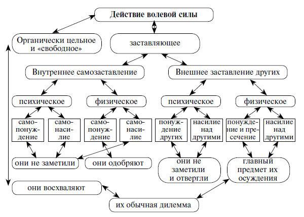 «Заставлением» следует называть такое наложение воли на внутренний или внешний состав человека, которое обращается не к духовному ви́дению и любовному приятию заставляемой души непосредственно, а пытается понудить ее или пресечь ее деятельность. Понятно, что если предварительное обращение к духовному ви́дению (будь то в словах убеждения или в виде подставления ланиты) совершится и вызовет в душе состояние очевидности, то возникнет свободное убеждение, и тогда осуществляющееся действие волевой силы будет органически-свободным, а не заставляющим; и точно так же, если предварительное обращение к любовному приятию вызовет в душе состояние любви, то возникнет согласие и единение, и тогда осуществляющееся действие волевой силы будет органически-свободным, а не заставляющим.