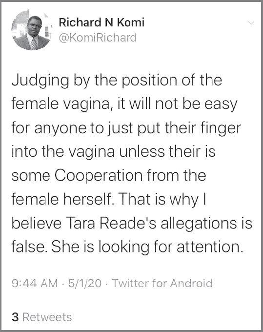 Для всех, кто радостно написал в соцсети Twitter Таре «ЗАКРОЙТЕ ЕЕ», у меня есть сообщение: Внимательно посмотрите на себя. ВЫ соучастники зла. Для тех, кто задается вопросом, почему Тара заговорила только тогда, когда Байден стал предполагаемым кандидатом – вам солгали! Откройте глаза, уши и сердца. Прислушивайтесь к пострадавшим не только тогда, когда это политически удобно. Жизнь непроста и запутанна. Но это не делает человека лжецом, это делает его сложным.