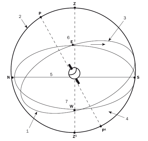 Рис. 1. Точки и круги небесной сферы: 1 – небесный экватор;2 – небесный меридиан; 3 – направление движения светил над горизонтом; 4 – истинный горизонт; 5 – полуденная линия; 6 – точка востока; 7 – точка запада