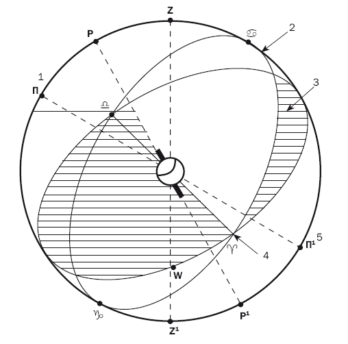 Рис. 2. Пересечение плоскостей эклиптики и небесного экватора:1 – северный полюс эклиптики; 2 – небесный меридиан;3 – эклиптика; 4 – точка весеннего равноденствия; 5 – южный полюс эклиптики