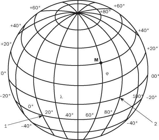 Большой полукруг, прочерченный через земные полюса и любую точку на поверхности Земли, называется меридианом данной конкретной точки. Нулевым, или начальным, принято называть меридиан, проходящий через Гринвичскую обсерваторию (Великобритания). Он совместно с меридианом, отстоящим от него на 180°, делит планету на восточное и западное полушария. Все изложенное наглядно иллюстрируется рис. 1.