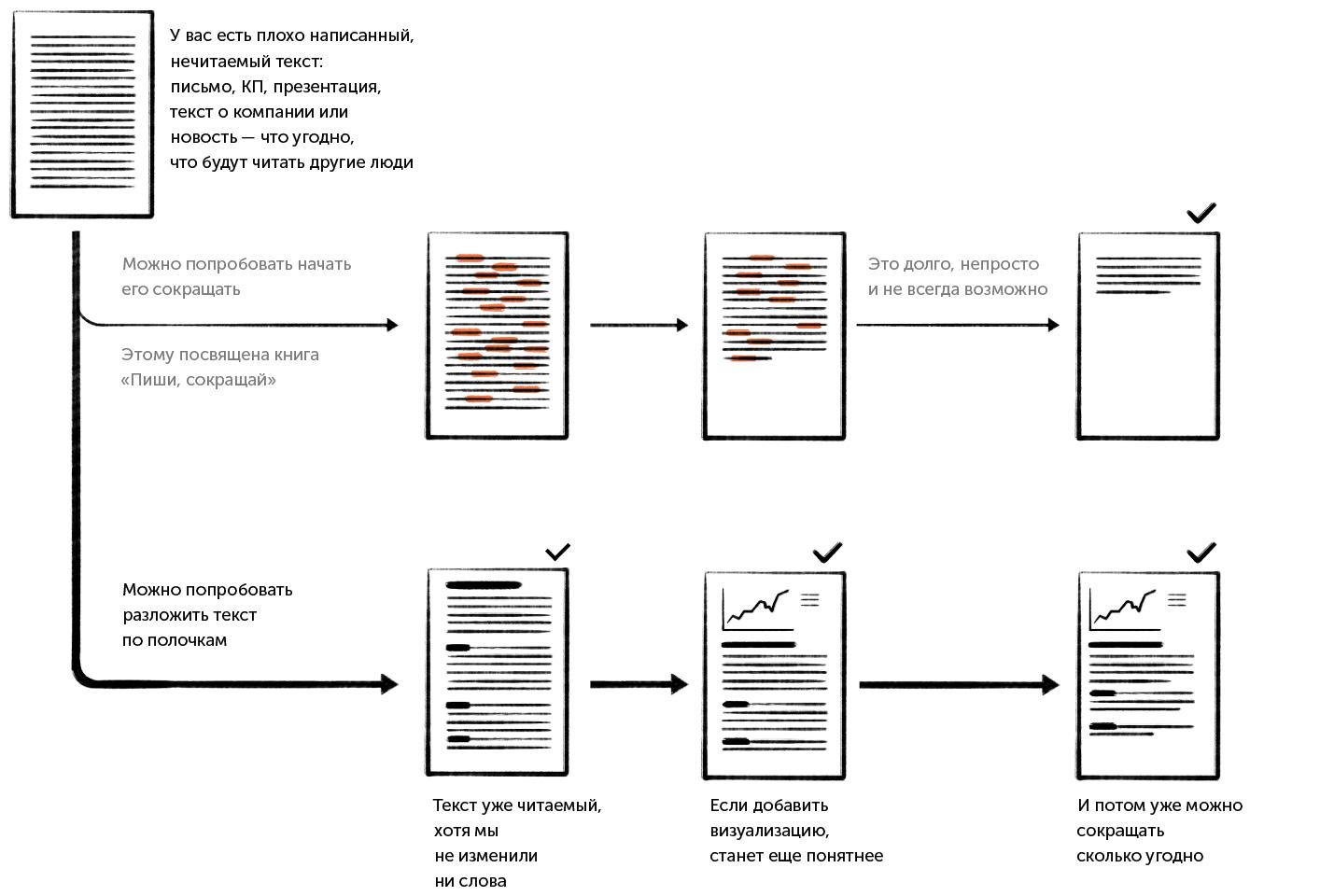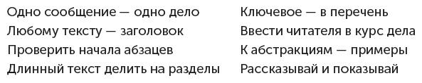 В целом все приемы в книге нацелены на то, чтобы сделать текст читаемее, проще и яснее; чтобы ваш адресат мог как можно быстрее понять суть и, если нужно, углубиться в детали. С таким запросом ко мне приходят руководители: «Сделайте так, чтобы тексты в нашей компании было легко читать».