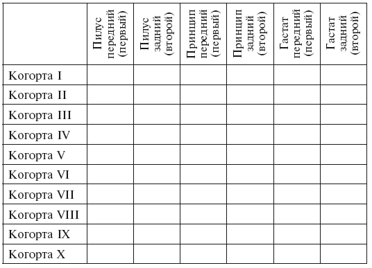 После перехода от манипулярной к когортной организации прежнее деление солдат на гастатов, принципов и триариев или пиланов устарело. Как только тактическая диспозиция перестала ограничиваться строго тремя линиями и построение в одну, две или три линии стало одинаково осуществимым, дифференциация войск по их положению на той или иной линии утратила смысл. В будущем названия гастаты, принципы и триарии сохранилось только для отличия ранга шестидесяти центурионов в легионе. По странной инверсии, аналогичной той, что раньше поменяла местами принципов и гастатов, пиланы (возможно, потому, что они изначально были самыми возрастными солдатами) теперь обозначали старших центурионов в каждой когорте, а гастаты – младших[7]. Центурионы теперь назывались prior и posterior (то есть передний и задний), а не правый и левый, как раньше. В когорте по ширине фронта располагалось три центурии, и еще три – за ними.