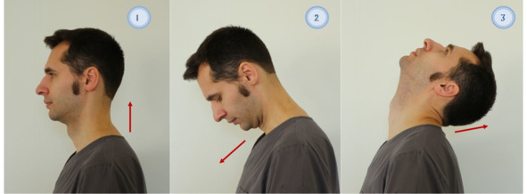Рис. 2. Наклоны головы вперед и назад. 1. Исходное положение («сидя» или «стоя»); 2. Наклон головы вперед; 3. Наклон головы назад.
