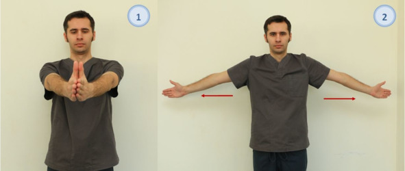 Рис. 4. Упражнение лечебной физкультуры: 1. Исходное положение «стоя» или «сидя», руки выпрямлены вперед перед собой, соприкасаясь ладонями; 2. Разводим руки в стороны. Повторяем 15—20 раз.