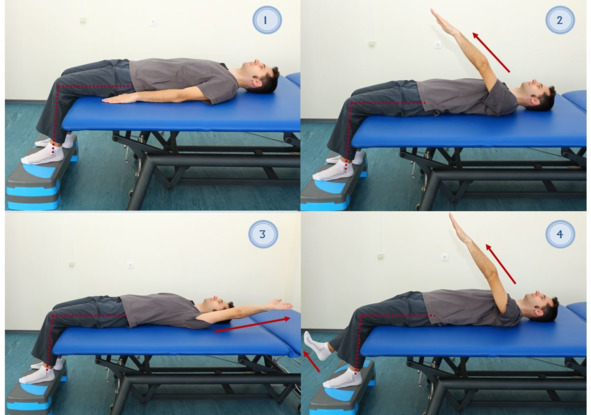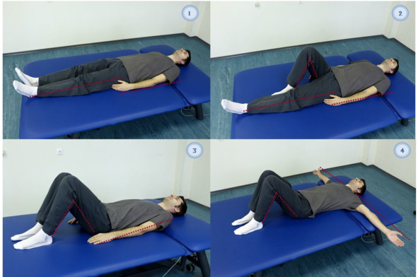 Рис. 6. Упражнение лечебной физкультуры, используется стол для Войта-Бобат терапии: 1. исходное положение «лежа на спине», руки вдоль туловища; 2. положение лежа на спине, сгибание правой ноги в коленном и тазобедренном суставе, руки вдоль туловища; 3. положение лежа на спине, сгибание левой ноги в коленном и тазобедренном суставе, руки вдоль туловища; 4. положение лежа на спине, обе ноги согнуты в коленных и тазобедренных суставах, руки разведены в стороны. Выполняется 5—10 повторений.