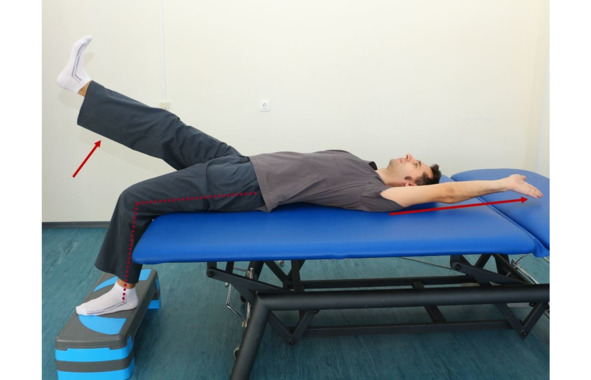 Рис. 8. Упражнение лечебной физкультуры, используется стол для Войта-Бобат терапии, степ-платформа: исходное положение — «лежа на спине», ноги согнуты в коленных суставах с опорой стоп на степ-платформу, руки вдоль туловища. Одновременно выпрямляем правую ногу и левую руку, задерживаем положение на 10—15 сек. Поочередно выполняем для правой ноги/левой руки и левой ноги/правой руки.