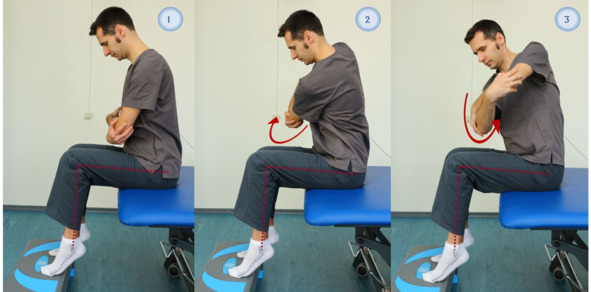 Рис. 9. Упражнение лечебной физкультуры, используется стол для Войта-Бобат терапии, степ-платформа: 1. Исходное положение — «сидя», нижние конечности согнуты в коленных и тазобедренных суставах, пальцы стоп с опорой на степ платформу, руки скрещены, кости на уровне локтей; 2—3. Поочередно выполняем наклоны в стороны со скрещенными руками, по 10 наклонов в разные стороны.