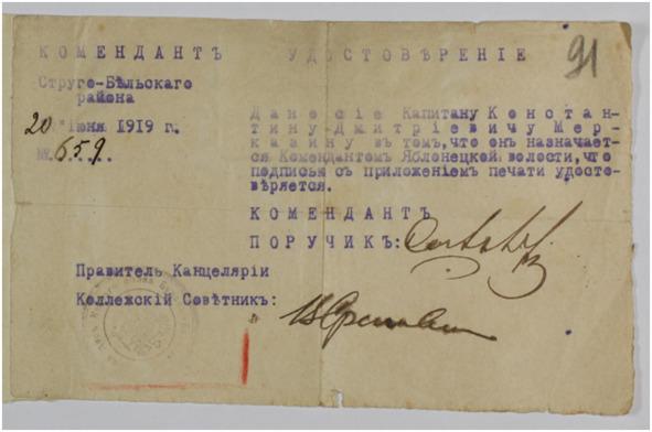 Мерказин осуществлял обязанности коменданта Яблонецкой волости с 20 июня до середины июля 1919 г. Впоследствии был отправлен в Нарву, где получил назначение в этапно-хозяйственный отдел в Гдов на должность заведующего заготовками.