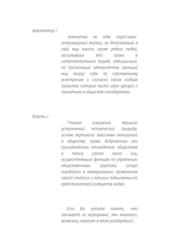 Убежден, что эти монологи дадутся мне намного сложнее, чем те, что описывали белую сторону личности архитектора. Всегда проще говорить о том, что находится у всех на виду. А о том, что скрыто глубоко внутри такого неоднозначного человека, как архитектор, и том, в каких созависимых отношениях с властью он состоит, в разы труднее. И все же я попробую, хотя очень ясно осознаю изначально провокативный характер предмета описания.