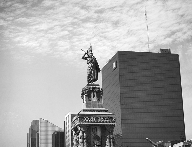 В районе современной Мезоамерики была другая великая цивилизация — ацтеков. Их сохраненные и восстановленные величественные храмы рассказывают нам о том, что это был героический народ. И теперь очень забавно, даже нелепо выглядит скульптура их последнего вождя на фоне современных небоскребов Мехико (рис. 3). Это случайность или закономерность развития?