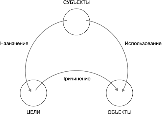 Уточним наш первый концепт: управление — целенаправленное изменение поведения объектов для исполнения намерений субъекта (субъектов). То есть это связанная отношениями тройка множеств: субъектов, их целей и объектов, выбранных для изменений. В этой тройке три основных отношения (рис. 6).