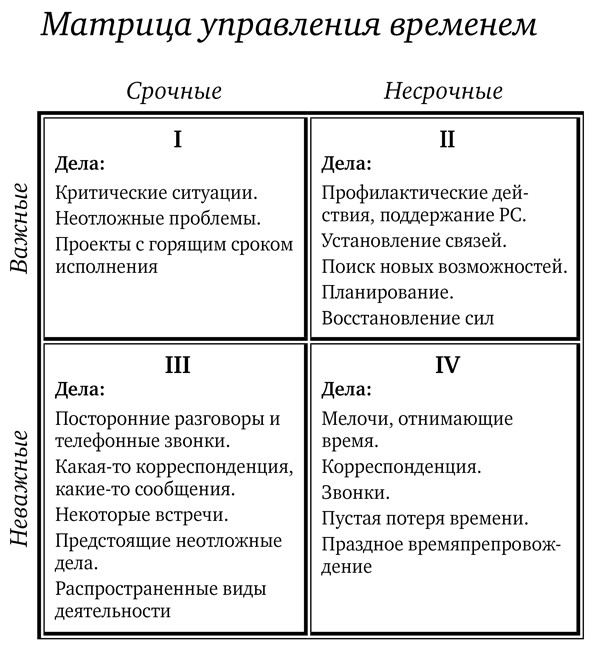 А вот эффективные менеджеры и собой управляют эффективно. При этом они реализуют первые три навыка из семи. Навык 1: быть проактивным. Эффективные менеджеры в решении проблем проявляют инициативу и творчество. Навык 2: с самого начала иметь ясное представление о конечной цели. Эффективный менеджер ясно видит, чего именно он хочет достичь, и это видение определяет все его повседневные действия и решения. Навык 3: сначала делать то, что необходимо делать сначала. Иначе говоря, заниматься тем, что действительно важно, и не позволять отвлекать себя на менее существенные вопросы.