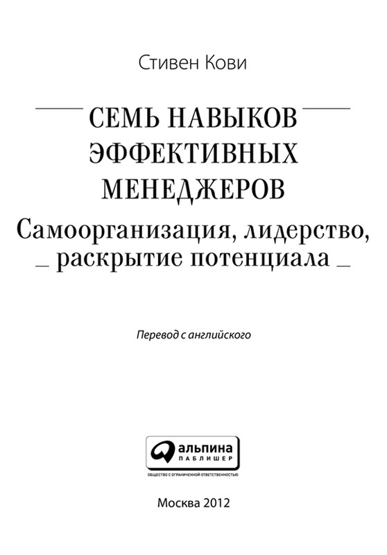 Семь навыков эффективных менеджеров: Самоорганизация, лидерство, раскрытие потенциала / Стивен Кови; Пер. с англ. — М.: Альпина Паблишер, 2012.