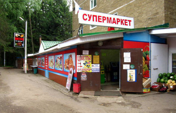 ЕСТЬ ЛАВКИ ПОСТОЯННЫЕ \ ВПОДОБИЕ УЕЗДНОГО \ ГОСТИНОГО ДВОРА. «Супермаркет» у бывшего КПП -1 бывшего военного городка Трудовая, ныне микрорайлон Трудовая, рабочий посёлок Некрасовский городского посёлка Некрасовский. Впрочем, супермаркет – это уже в военном городке №1. Перемещаемся в него из мкр Строителей по тропинке.