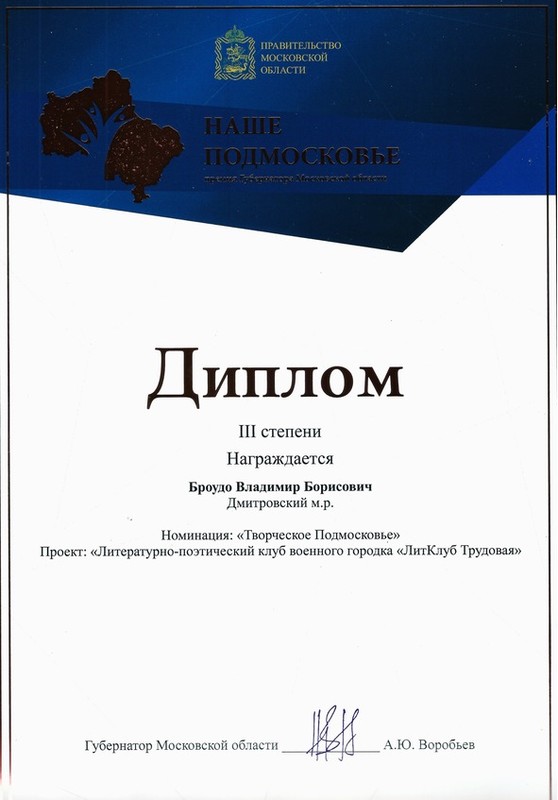 Литературно – поэтический клуб военного городка (микрорайона) Трудовая (гп Некрасовский, Дмитровский район, Московская область) ещё совсем молодой – он создан в июне 2012 года по инициативе Владимира Борисовича Броудо (творческий псевдоним Арсений Одуорб).