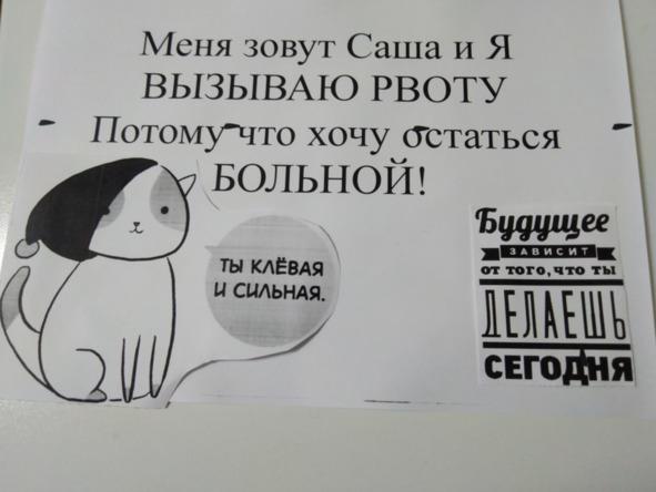 Супервизируемому психологу, работающему в гештальт-терапии с пациенткой с булимией, было предложено дополнить свои вмешательства приёмом, повышающим ответственность пациентки за симптом и поведение. Предполагалось, что она нарисует для своей подопечной плакат следующего содержания (рис.2) и повесит его над туалетом (Пациентка находилась в клинике). Перед каждым посещением туалета страдалица должна взглянуть на плакат. Если предложение верно, она продолжит вызывать рвоту (компульсивное поведение, «импульсивный ребёнок»), если нет — выйдет из туалета и скажет себе: «Я сильная и клёвая!» (Здоровый Взрослый). В этом случае пациентка будет каждый раз делать выбор между здоровьем и болезнью. Другие пациенты также могут помочь ей сделать более позитивный выбор.