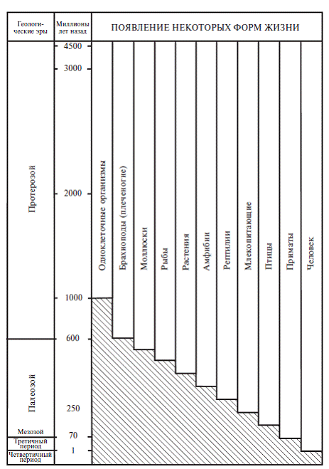 В конце концов, в результате длительных процессов, продолжавшихся миллиарды лет, поверхность Земли обрела ту форму и характеристики, которые мы видим сегодня. За это время значительным изменениям подверглись формировавшиеся горы и почва, а также появившиеся живые организмы. Новые виды жизни росли и развивались. В эру палеозоя, наиболее раннюю из четырех геологических периодов, появились моллюски, рыбы, растения и другие виды сложных организмов. В мезозое свои первые шаги сделали животные (правда, тогда еще человека среди них не было). Приматы, отряд, к которому, в частности, принадлежит и человек, появились только в третичный период, 50 миллионов лет назад. История человечества начинается только в эпоху плейстоцена.