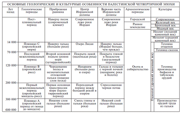 В других районах средиземноморского побережья геологи обнаружили более значительные изменения уровня моря. Тщательным исследованиям подверглись прибрежные районы Италии и юг Франции. Обнаруженные там свидетельства двух значительных трансгрессий согласуются с теми, которые произошли на побережье Леванта, и говорят о том, что на всей территории Европы имели место два длительных межледниковых периода. Первый получил название палеотирренийский, а второй – эутирренийский. Во время первого Средиземное море поднялось на 20–24 метра выше современного уровня, второго – на 6–9 метров. Благодаря этому можно определить возраст наносных песчаных пляжей Палестины и Сирии. Но следует обратить внимание на то, что тектонические и прочие подвижки также повлияли на изменения в рельефе, и поэтому современный уровень этих пляжей сильно отличается от того, который был в период их формирования. Стратиграфия напластований, обнаруженная в прибрежной долине, свидетельствует о том, что четвертичная эра характеризовалась последовательной сменой дождливых и засушливых периодов. Они соотносятся с трансгрессиями и регрессиями моря, происходившими в то же время в Северной Европе, Сибири и Канаде. Своеобразие Палестины заключается в том, что здесь мы сталкиваемся всего с тремя плювиальными эпохами, хотя в Европе их было четыре. Первый палестинский плювиал был очень долгим – он захватил почти половину четвертичной эры – и вполне может соответствовать европейским гюнцу и минделю (два следовавших друг за другом оледенения в Альпах. – Пер.).