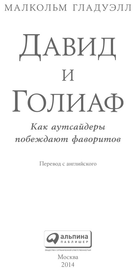 Книга «Давид и Голиаф» повествует об обычных людях, противостоящих гигантам. Под гигантами я подразумеваю серьезных противников всех мастей: от армий и могучих воинов до ограниченных возможностей, ударов судьбы и притеснений. Каждая глава рассказывает историю одного человека — знаменитого или неизвестного, заурядного или талантливого, — который, столкнувшись с тяжелейшими проблемами, вынужден действовать тем или иным образом. Как быть: играть по правилам или довериться своим инстинктам? Сдаться или держаться до последнего? Нанести ответный удар или простить?