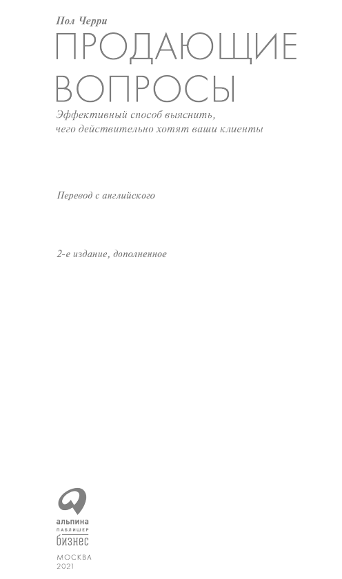 Хорошие вопросы живут дольше, чем люди, их задавшие. Хорошие вопросы всегда в цене. Книгу Пола Черри, второе издание которой вы держите в руках, следовало бы назвать не «Продающие вопросы», а «Драгоценные вопросы», поскольку они приносят пользу как тому, кто их задает, так и тому, кто на них отвечает. Его вопросы помогают людям, чья задача — найти на рынке покупателя, потребности и нужды которого должны удовлетворить продукт или услуга, созданные усилиями множества людей.