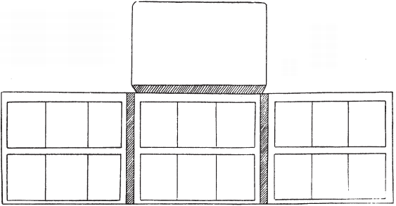 Предлагаемый на рисунке ящик делится на три отделения: глухое, подъемное и скрытое, прикрываемое подъемным отделением. Первые два, в свою очередь, делятся на более мелкие отделения; последнее же не имеет перегородок, и в него можно положить все, что не уложится в другие отделения.
