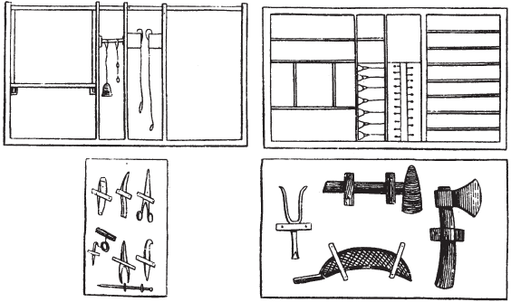 Рис. 14. Справа вверху – план ящика; ниже – крышка с топориком, молотком, отцепом и складным сачком. Слева вверху – вертикальный разрез ящика; снизу – план крышки отделения для лесок с ножиком, скальпелем, ножницами, нитью для рыбы, щипцами, пинцетом и иглою