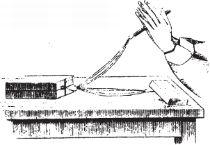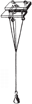 Другой, весьма простой, прибор для той же цели состоит из 2 дощечек с 3 кривыми шпеньками, так что, держа нижнюю дощечку, можно свободно вращать верхнюю. К концу каждого шпенька, загнутого крючком, привязывается один или несколько конских волос с гирею на конце. От вращения верхней дощечки будут закручиваться и самые волосы.