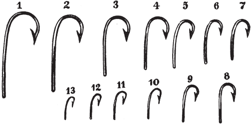 Самые лучшие крючки английские. Они хорошо закалены, так что не ломаются и не разгибаются, жало у них конусообразно, достаточно длинно и тонко, бородка хорошо поставлена, наконец, все части крючка соразмерны. Немецкие крючки значительно хуже английских, а русские продажные никуда не годятся. Только в некоторых местностях можно достать очень хорошие самодельные крючки для крупной рыбы, изготовляемые самими рыболовами из косной стали[1].