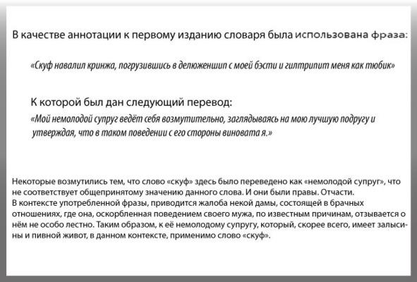 Данный словарь не признан нормативным, не претендует на звание такового, и представляет собой справочное пособие, в котором собраны наиболее распространенные неологизмы и современные сленговые слова. На момент выхода настоящего издания, часть слов могла перейти в разряд устаревших, а другая часть могла быть упущена. Все слова, включенные в данный словарь, не являются обязательными к использованию.