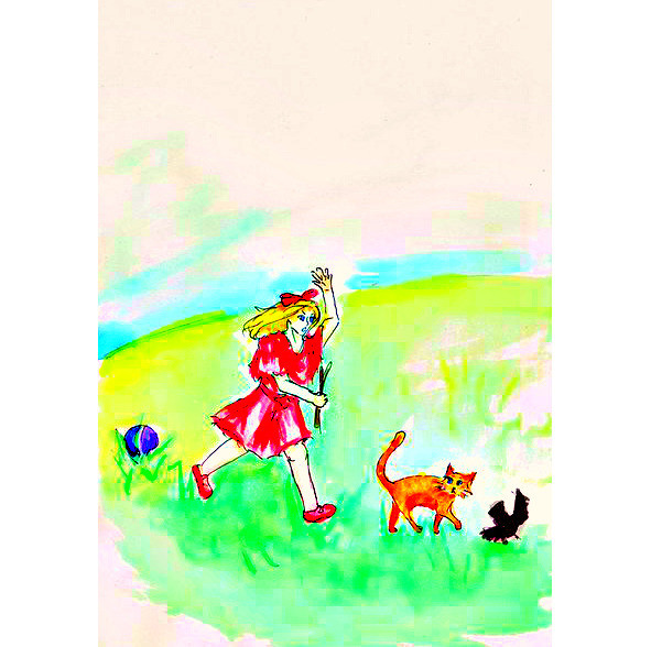 Поговорив с мамой, она вприпрыжку убежала к любимому коту Фантику, который тем временем охотился за воробьями. Вспомнив слова мамы, она поняла, что Фантик не прав. Взяла прутик и стала гоняться за ним по двору, пытаясь ударить его, крича ему вслед: