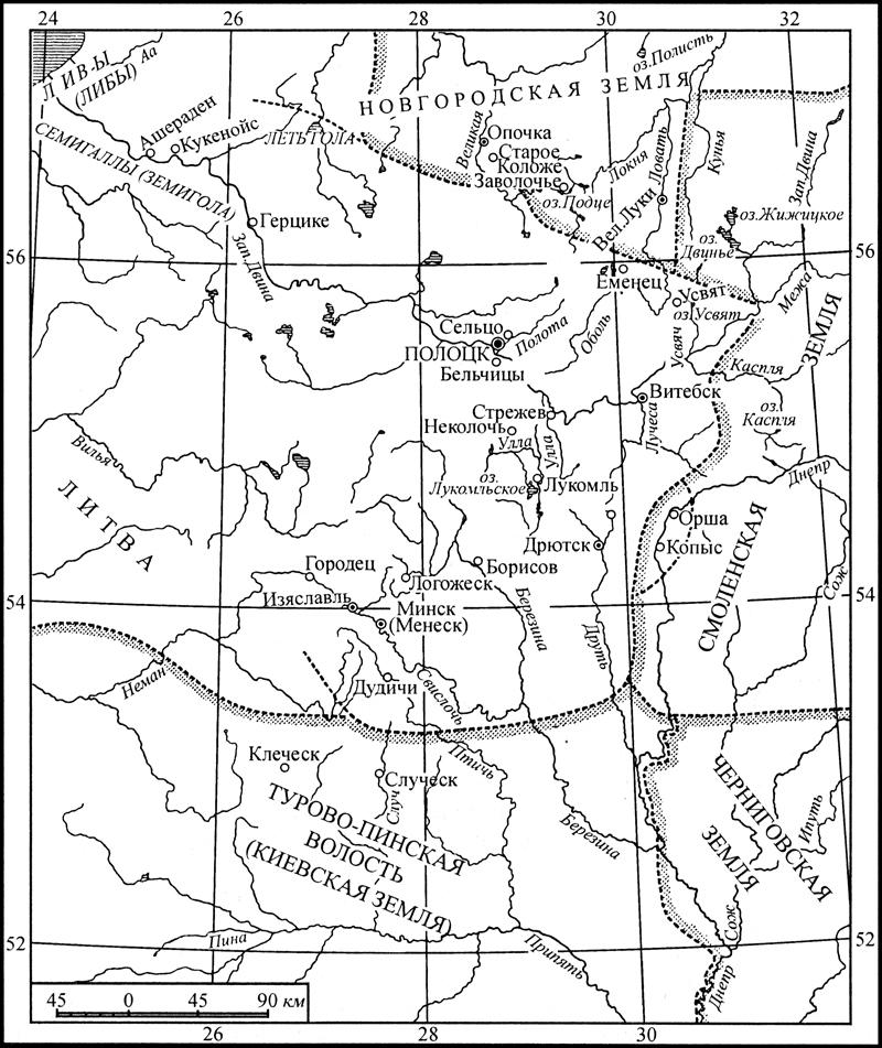 В рассматриваемое время процесс обособления русских княжеств уже имел более чем двухвековую историю. Полоцк первым приобрел собственную династию из рода Рюриковичей. В начале XI в. Владимир Святой передал эту землю своему сыну Изяславу, за потомками которого утвердилось наследственное владение. Уже в начале XII в. ливы, курши, земгалы и латгалы были данниками Полоцка. Однако контроль над племенами Латгалии и Подвинья русские князья на рубеже XII–XIII вв. практически мирно уступили Ливонскому ордену и Рижскому архиепископу[3]. Давление Литвы периодически ставило Полоцкое княжество на грань выживания. К XIII в. княжество пришло сильно раздробленным и лишенным политического веса. В 1223 г. в результате короткого похода смоленские войска утвердили свой протекторат над полоцкими землями. Судя по всему, за местной династией сохранились лишь мелкие, зависимые от Смоленска (и Литвы) держания: Минское, Витебское, Друцкое, Изяславское, Городецкое и Логожское княжества[4].