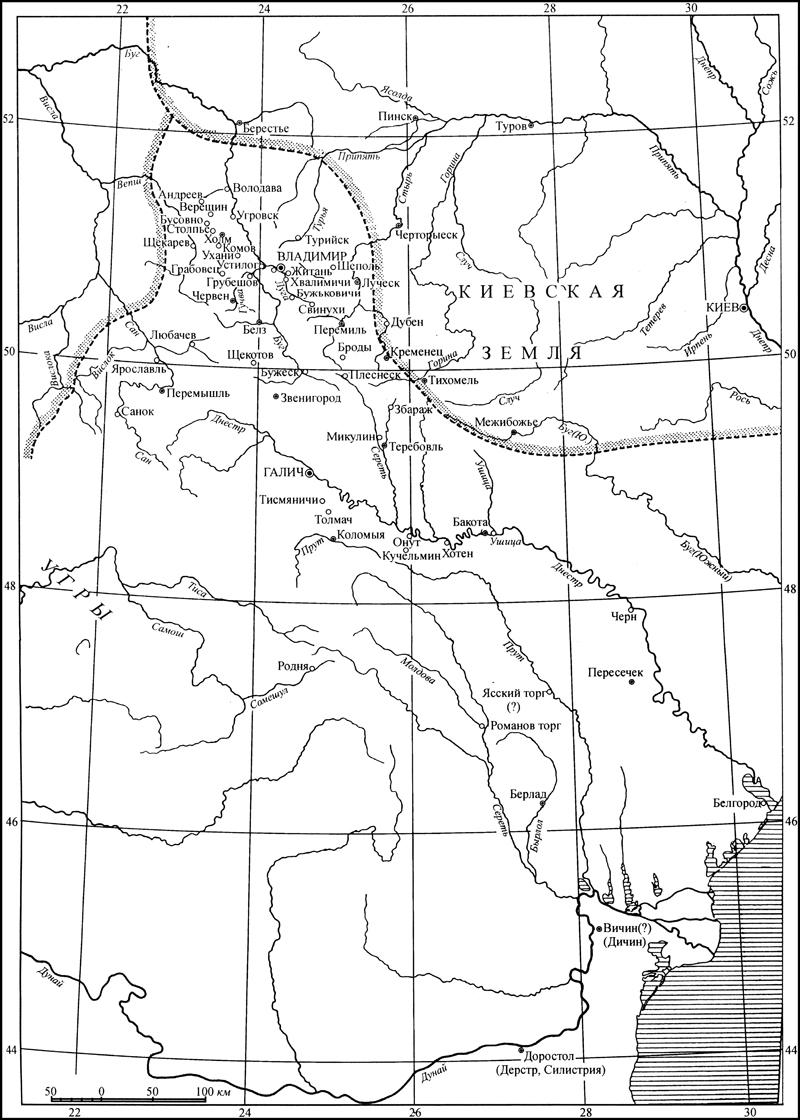 Волынскими князьями – после того как в 1156 г. сын Изяслава Мстиславича Мстислав изгнал из Владимира Волынского своего дядю Владимира – стали Изяславичи. В начале XIII в. волынский князь Роман Мстиславич подчинил своей власти Галич, а затем Киев. Лишь его внезапная смерть в 1205 г. во время похода на Польшу прервала стремительный процесс формирования нового могущественного государства. После 1205 г. Владимир Волынский несколько раз переходил из рук в руки, пока в нем в 1214 г. не закрепились сыновья Романа Даниил и Василько, приступившие вскоре к возрождению империи отца. Галич в это время захватили венгры, попытки выбить их продолжались вплоть до утверждения там в 1219 г. Мстислава Мстиславича Удалого, который, в свою очередь, вынужден был в 1221–1222 гг. заключить мир с венграми на условиях наследования галицкого стола после его смерти венгерским королевичем Андреем. Мстислав умер в 1228 г., и с этого года берет начало длившаяся вплоть до монгольского нашествия затяжная битва за Галицию, в которой неизменно участвовали, а потом и победили волынские князья[6].