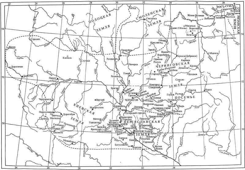 Киевская, Черниговская, Переяславская, Турово-Пинская и Берестейская земли в XIII в. Границы указаны схематически.