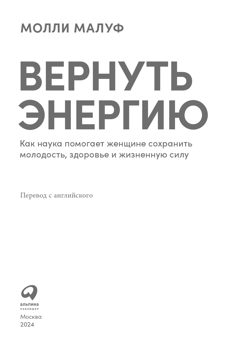Молли расскажет, как это сделать. Микроскопические аккумуляторы не просто хранят электрический заряд — их функционал гораздо шире, и из книги вы узнаете, как их заряжать, как ими пользоваться и как их активировать. Одно из неоспоримых достоинств книги «Вернуть энергию» — наличие информации не только о том, как скорректировать диету и физические упражнения для увеличения энергетического запаса, но и о том, как побороть стресс, сажающий наши батарейки. Молли описывает «сигналы небезопасности» и то, как детские травмы могут стать основой нашего стресса. Кроме того, она углубляется в тему влияния гормонов на жизнь женщин (и помогает их взломать), а также отвечает на вопросы об отношениях и сексе, которые вы боялись задать своему врачу. Эта книга — поистине полное руководство по вопросам биохакинга.