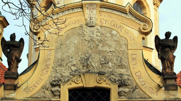 Побывать внутри мне не удалось, но, судя по имеющимся описаниям, убранство костела не назовешь роскошным. Зато там можно увидеть фрески, посвященные не только библейским сюжетам, но и битве на Белой горе. То же сражение изображают лепные рельефы на фронтоне западного портала — их можно увидеть, и не заходя во двор или в само здание. Южный портал украшен скульптурами ангелов и святых. В частности, здесь представлены св. Рох и св. Себастьян, считавшиеся защитниками от чумы.